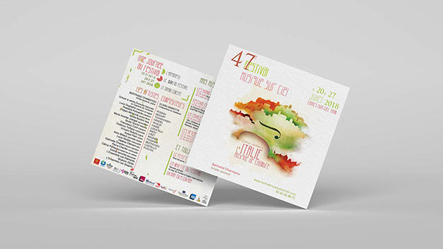 " Pour cette nouvelle édition du festival de musique sur ciel, j’ai souhaité mettre à l’honneur un support de communication plus proche de l’œuvre musical et de son merchandising, soit un format carré de 12x12 et 15x15 en rappel aux pochettes cd.