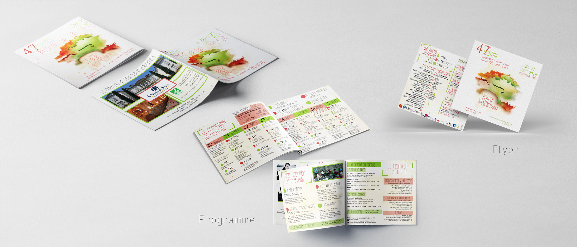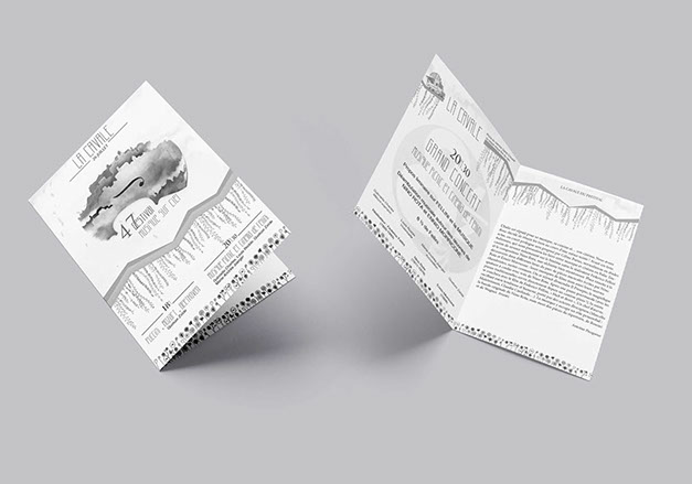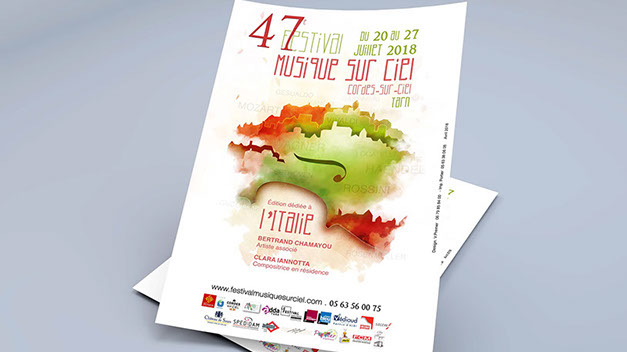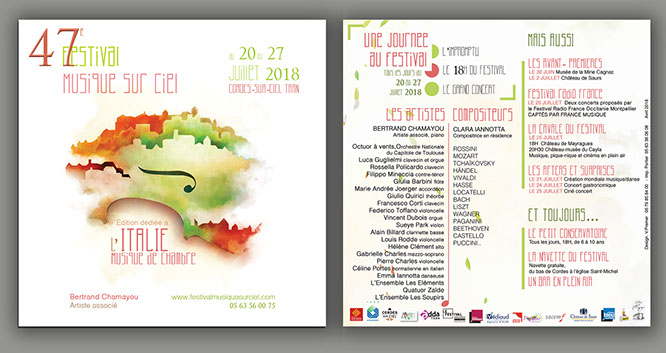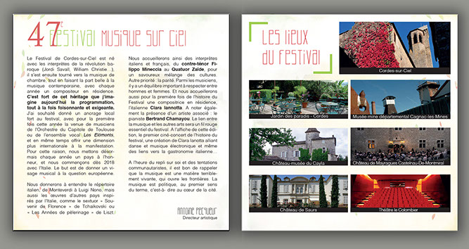 " Pour cette nouvelle édition du festival de musique sur ciel, j’ai souhaité mettre à l’honneur un support de communication plus proche de l’œuvre musical et de son merchandising, soit un format carré de 12x12 et 15x15 en rappel aux pochettes cd.